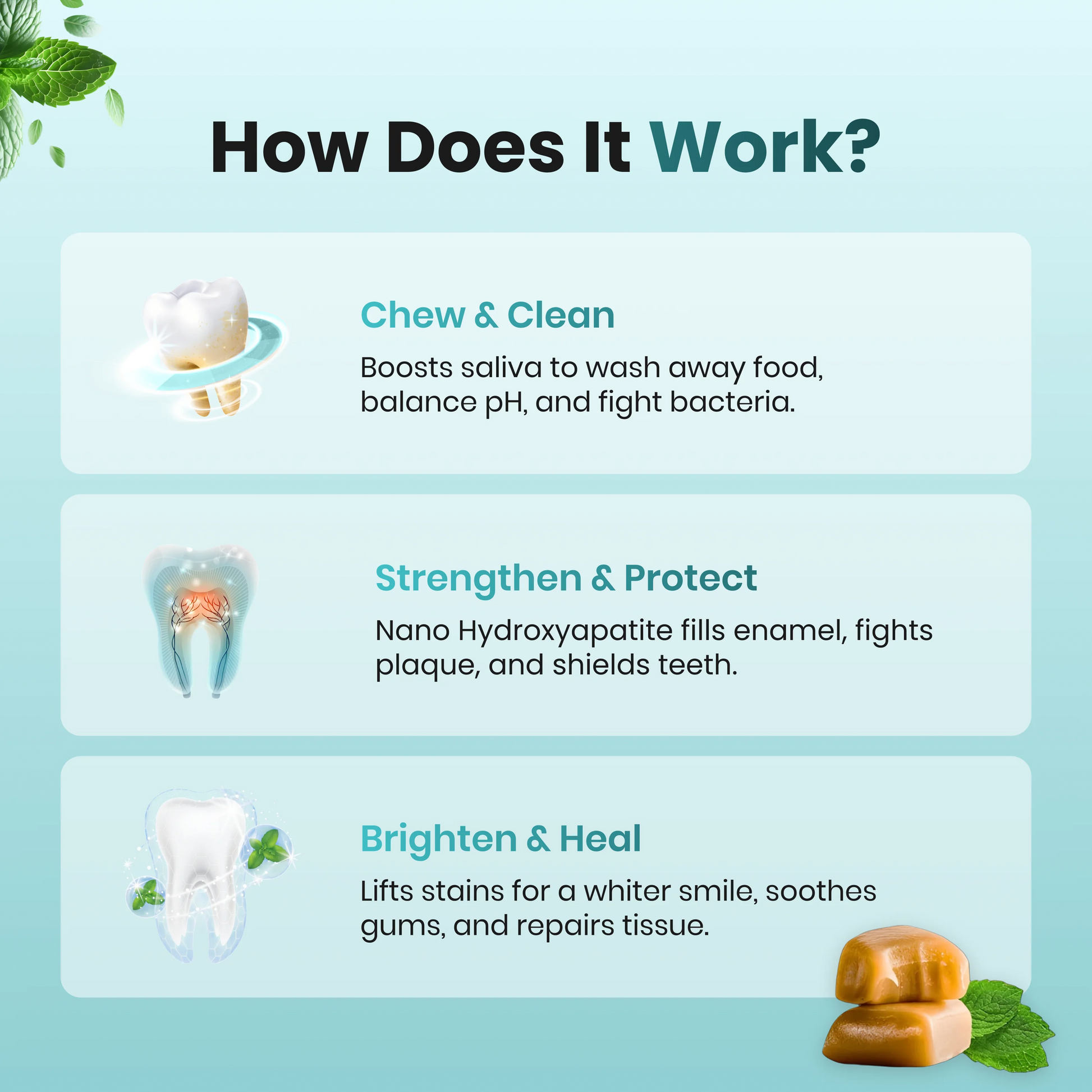 10x Saliva Flow: Chewing acts as a biological delivery system, flushing active ingredients into every hard-to-reach gap between your teeth.